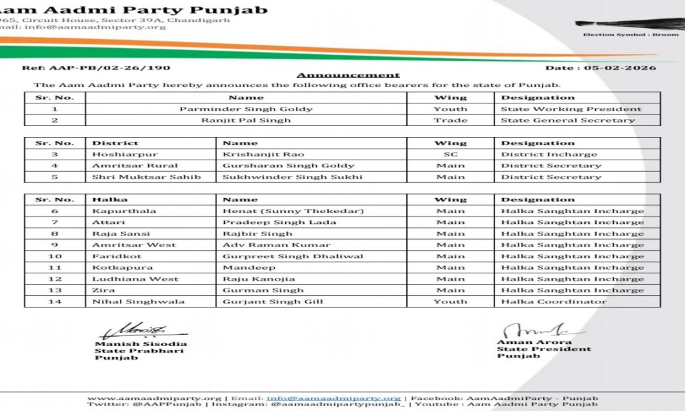 आम आदमी पार्टी (आप) पंजाब ने संगठनात्मक ढांचे को और सशक्त करने के उद्देश्य से विभिन्न विंगों में नए पदाधिकारियों की नियुक्ति की है। इन नियुक्तियों से राज्य के ज़िलों और विधानसभा क्षेत्रों में पार्टी की पकड़ और मज़बूत होने की उम्मीद है।