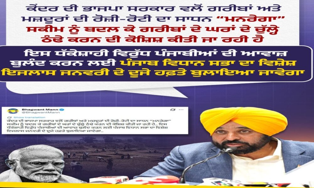 पंजाब के मुख्यमंत्री भगवंत मान ने केंद्र सरकार द्वारा मनरेगा को बदलकर VB-G RAM G (विकसित भारत गारंटी फॉर रोज़गार एंड आजीविका मिशन ग्रामीण) योजना लाने के फैसले पर गुरुवार को तीखी प्रतिक्रिया व्यक्त की। मुख्यमंत्री ने इसे गरीबों की आजीविका पर सीधा हमला करार देते हुए कहा कि बीजेपी सरकार महात्मा गांधी का नाम हटाने के साथ-साथ योजना की मूल भावना को ही खत्म करने पर तुली है। मान ने घोषणा की कि राज्य सरकार जनवरी के दूसरे सप्ताह में पंजाब विधानसभा का विशेष सत्र बुलाएगी, जिसमें इस मुद्दे पर पंजाबियों की आवाज बुलंद की जाएगी। यह निर्णय आम आदमी पार्टी के राष्ट्रीय संयोजक अरविंद केजरीवाल सहित शीर्ष नेताओं की बैठक के बाद लिया गया है।