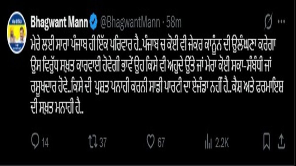 इस पूरे मामले पर मुख्यमंत्री Bhagwant Singh Mann ने सोशल मीडिया पर प्रतिक्रिया देते हुए साफ संदेश दिया। उन्होंने लिखा, “मेरे लिए पूरा पंजाब एक परिवार है। अगर कोई भी व्यक्ति कानून का उल्लंघन करेगा, तो उसके खिलाफ सख्त कार्रवाई होगी, चाहे वह किसी भी पद पर हो या कितना भी प्रभावशाली क्यों न हो। हमारी सरकार किसी की भी पैरवी या सिफारिश को स्वीकार नहीं करती।”